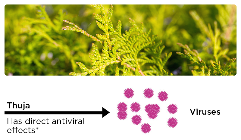 They act directly against cold viruses and boost the production of immune cell messenger substances in the body. The key active substances of thuja are polysaccharides and glycoproteins.
