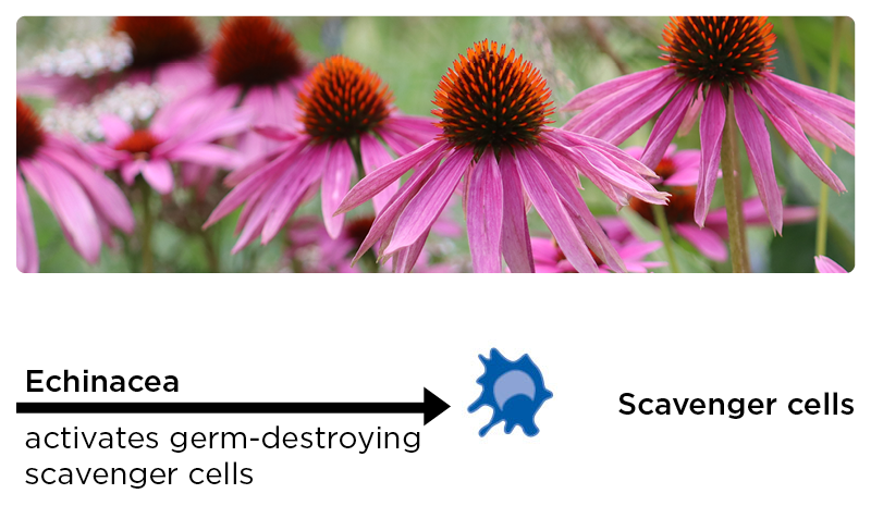 To fight off harmful germs like the ones that cause colds, our body uses "scavenger cells" which destroy the germs. Scientific research shows that echinacea activates these scavenger cells (macrophages) to destroy the germs and also acts directly against the invading viruses.